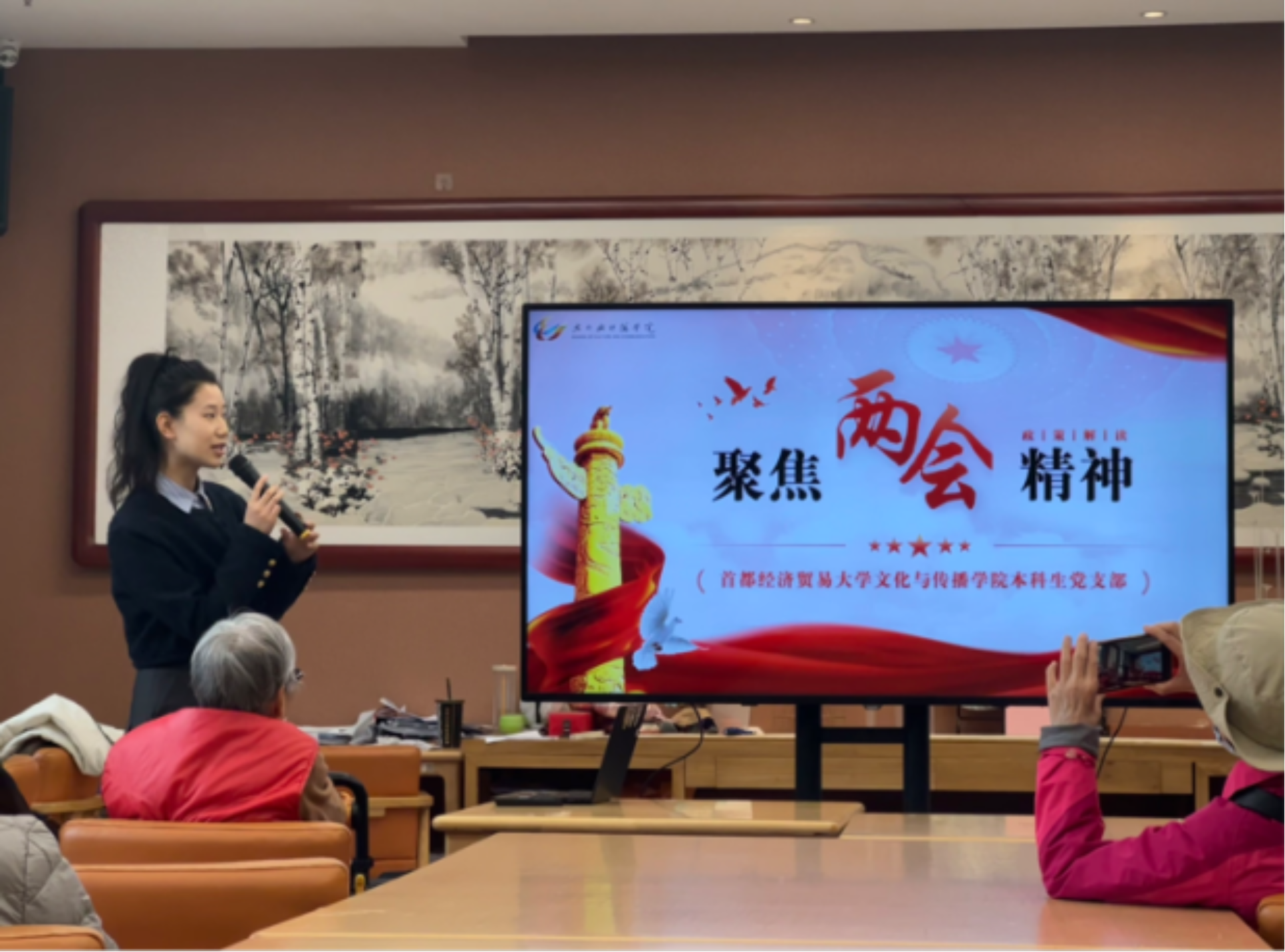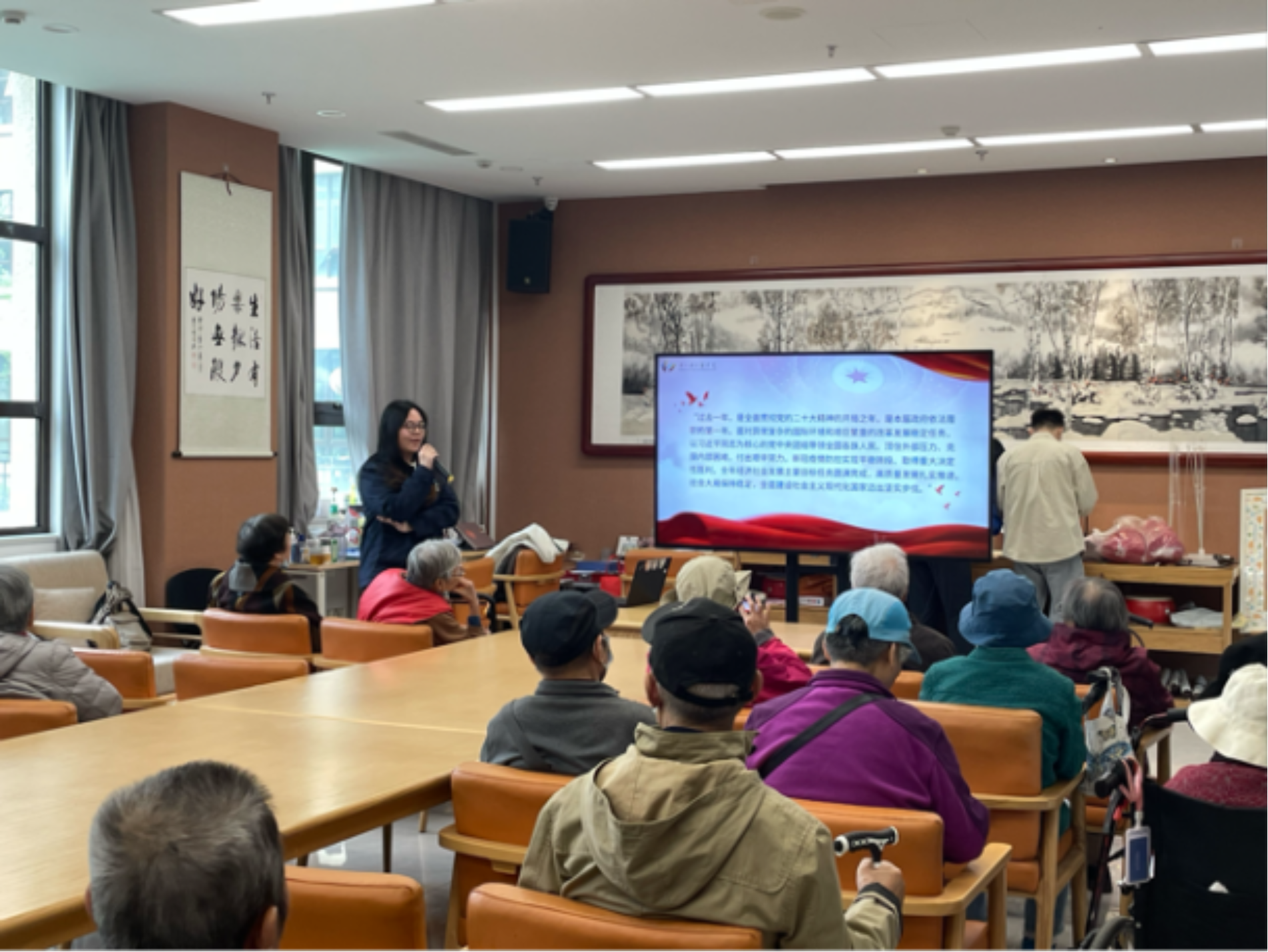 活动开始,首先由支部组织委员谭若冰向养老院的老党员同志们传达了两会精神,共同学习了政府工作报告。她提到,今年是新中国成立75周年,是实现“十四五”规划目标任务的关键一年,今年全国两会的圆满举行,必将凝聚起强国建设、民族复兴的强大信心和力量。同时,她重点解读了两会中的养老政策“红包”,相信这些新部署、新要求能让更多老年人及其家庭获得实实在在的幸福感、安全感。