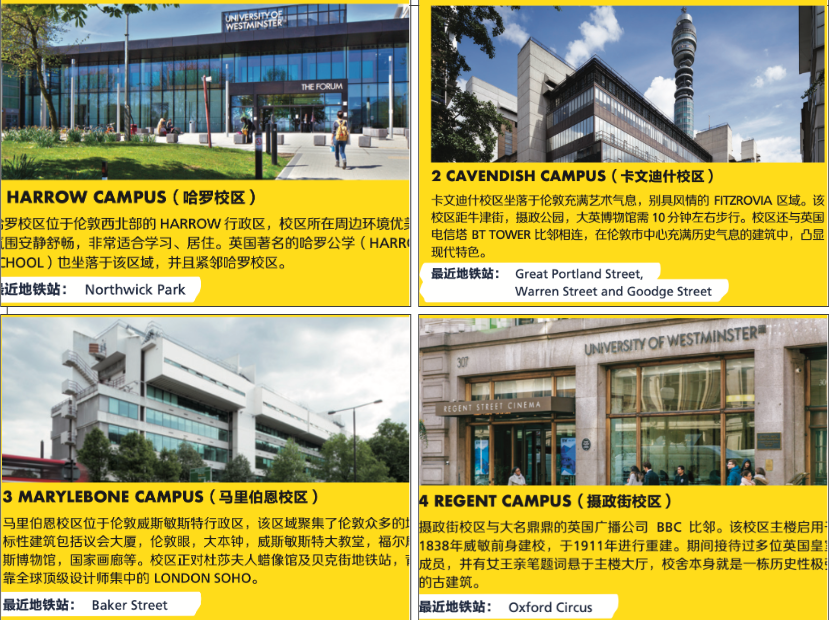 威斯敏斯特大学(University of Westminster)一所公立研究型大学,诞生于1838年。在伦敦有4个校区,其中3个校区位于伦敦市中心位置,另外一个在伦敦西北部的哈罗地区。位于伦敦市中心的3个校区地理位置优越,彼此之间步行即可到达。