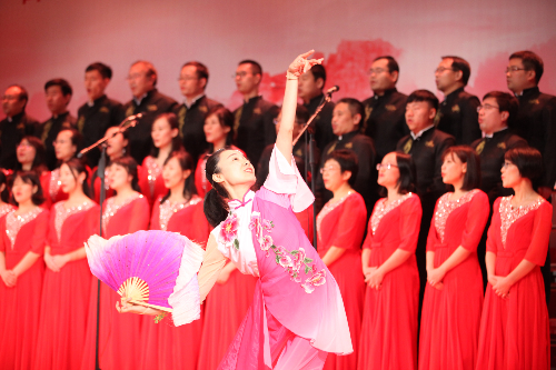 走上琢玉讲堂的舞台,面对全校同仁的注视,聚光灯下难免会有一丝紧张,但随着韩丽老师娴熟优美的钢琴伴奏响起,大家迅速进入状态。演唱中,大家面带微笑,节奏铿锵,声音洪亮,唱出了对祖国的深情与祝福。领唱吴伟凡老师的美声和伴舞王阳阳老师的舞姿,赢得了阵阵掌声,随着指挥杨伶老师一个果断有力的手势,演唱在全场喝彩中圆满结束。