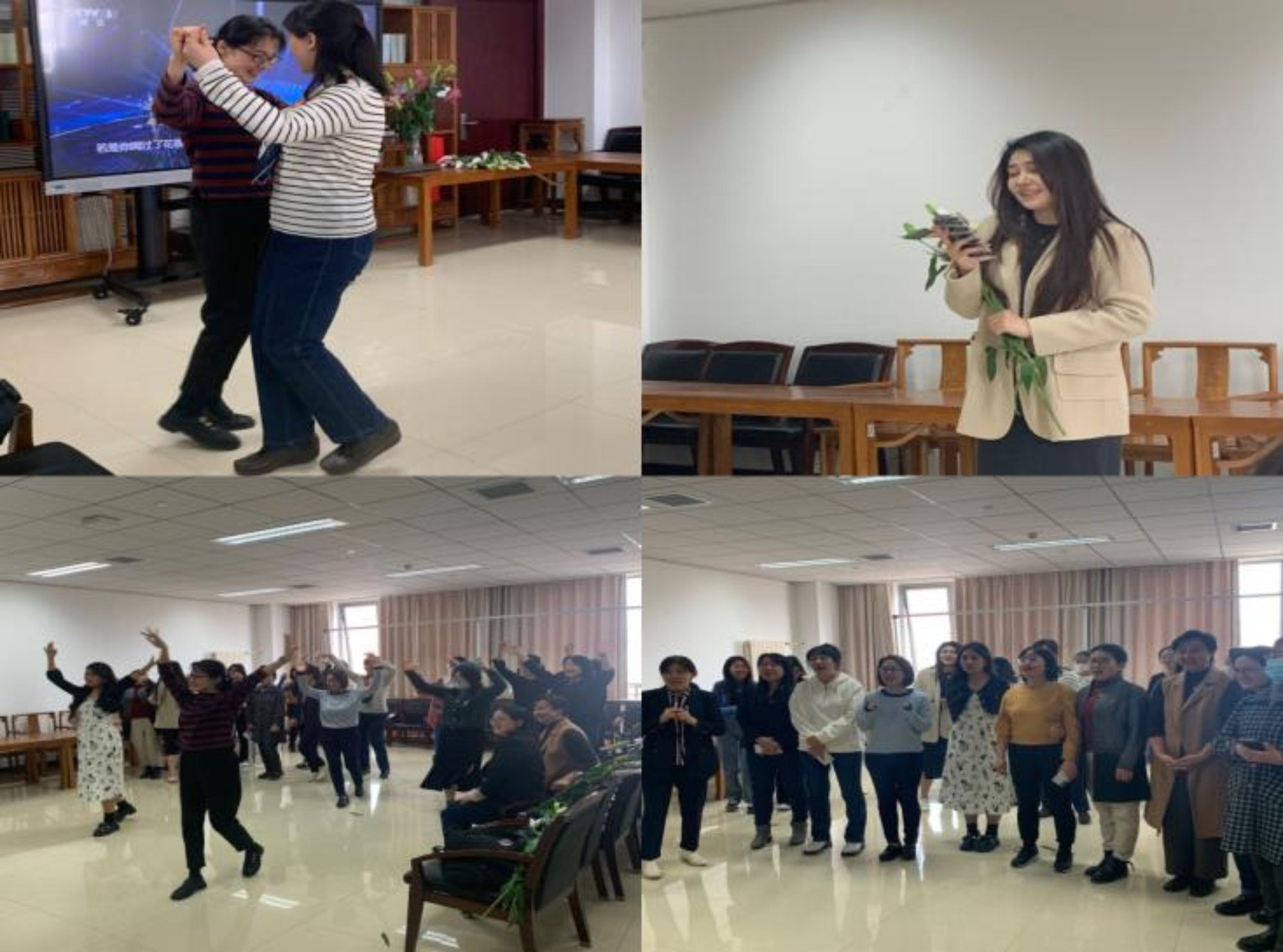 在这片浓浓的“诗情”和“花意”中,学校第三届教职工文化体育节歌唱比赛一等奖获得者李芊芊老师领唱“隐形的翅膀”、“萱草花”,教师们合唱“长大后我就成了你”、“女人花”、“铿锵玫瑰”等歌颂女性的主题歌曲,大家在歌声中为女性点赞,更为自己加油!接下来,新澳门六合彩高手论坛 分工会副主席王阳阳老师领舞,女教职工们共同跳舞,气氛热烈,活动现场一片欢声笑语。