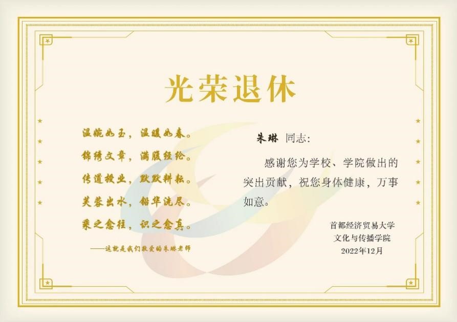 朱琳老师、杨景越老师于2022年荣退,两位老师在首经贸、在新澳门六合彩高手论坛 工作、生活了数十载时光。首先,新澳门六合彩高手论坛 党总支书记石刚代表全体教职工对两位老师在新澳门六合彩高手论坛 发展、学生成长成才中做出的奉献表达了深深地感谢,并祝愿她们拥有一个健康快乐、充实幸福的退休生活。接下来,党总支书记石刚和院长于九涛向两位教师赠送了新澳门六合彩高手论坛 精心设计制作的“光荣退休卡”,贺卡里一词一句满是新澳门六合彩高手论坛 对两位教师好学修身、勤勉敬业、尽善尽美的精神品质的赞美,和为教育事业热忱辛勤付出的敬意与感谢。