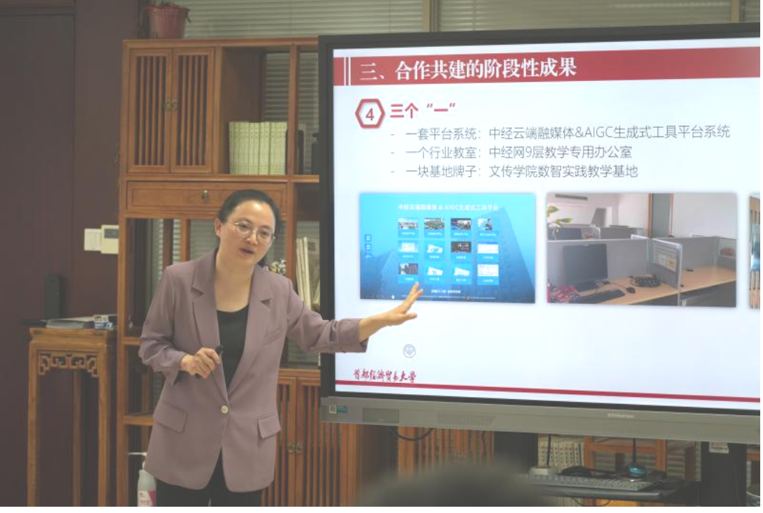 徐轶瑛就传播学系数智化改革重点进行汇报。她围绕《网络与新媒体》微专业建设,介绍了转型中与中国经济网合作共建思路、做法和成果。