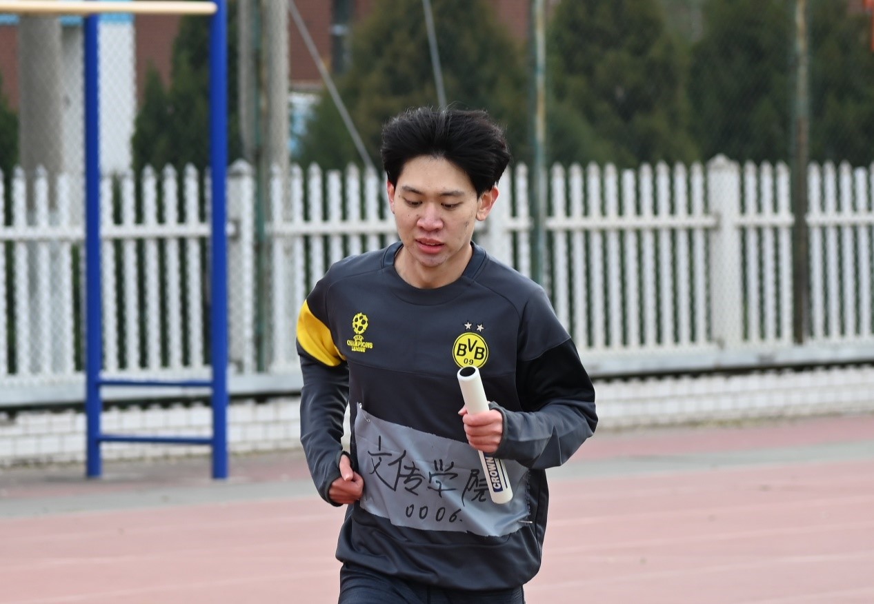 随后是由高洪轩、潘腾、阿布拉江、彭希、冯文强组成的男子接力赛。他们要跑的圈数比女生组要多一圈,多一圈难度就增加了数倍,但他们仿佛不知疲倦一般奋力直追,不断缩小着与前面同学的距离,努力拼搏,只为给文传增光添彩!