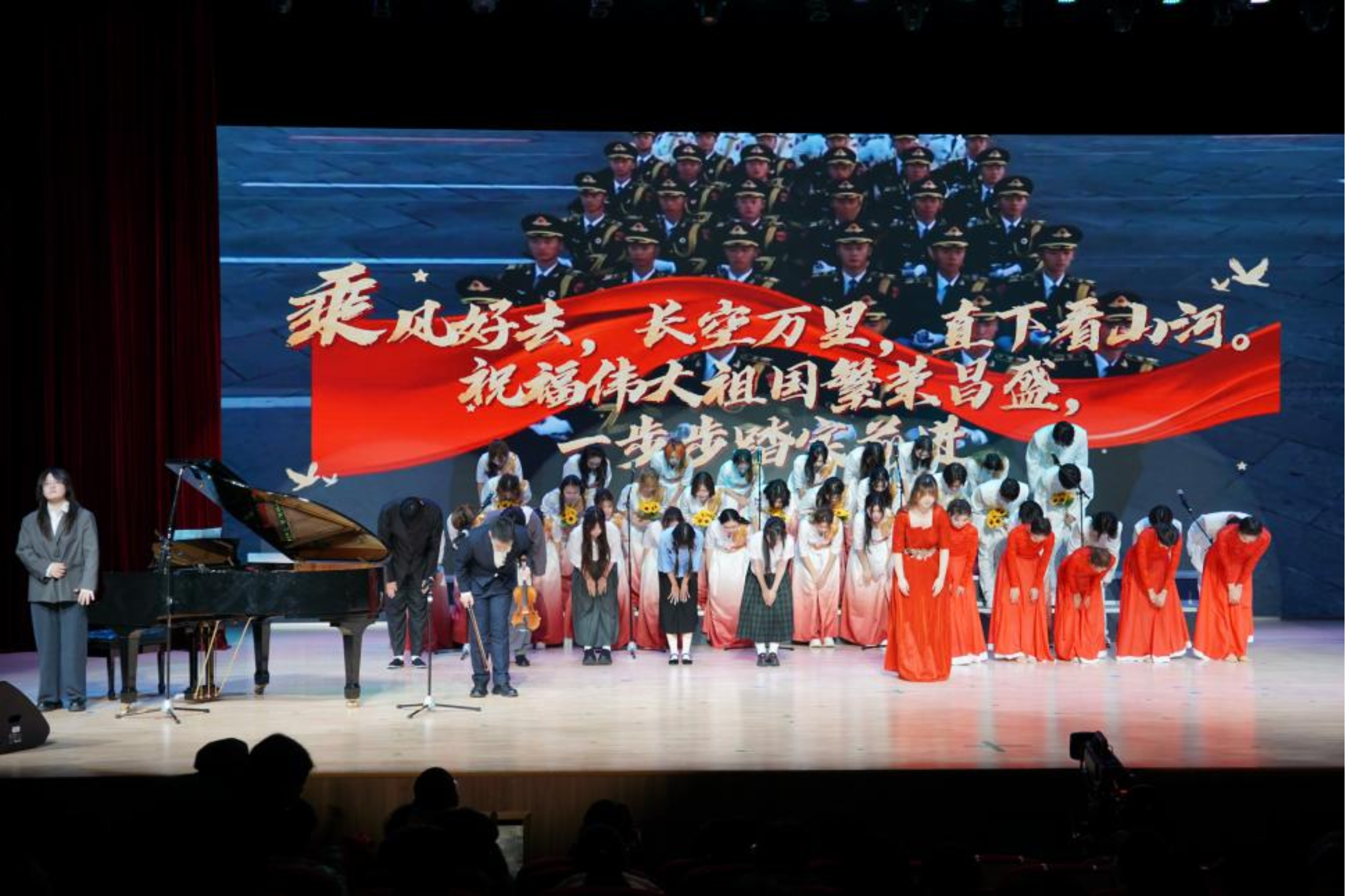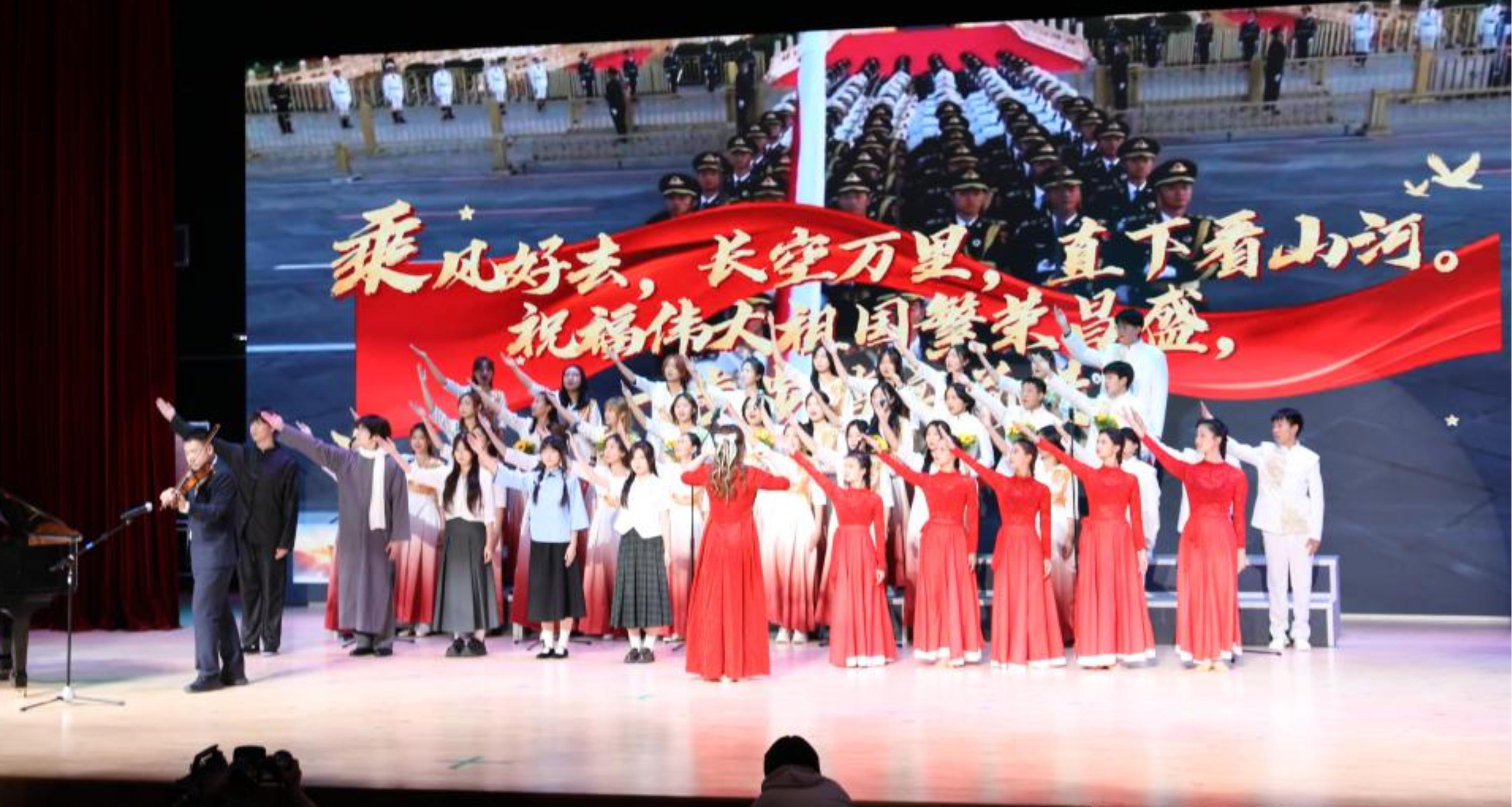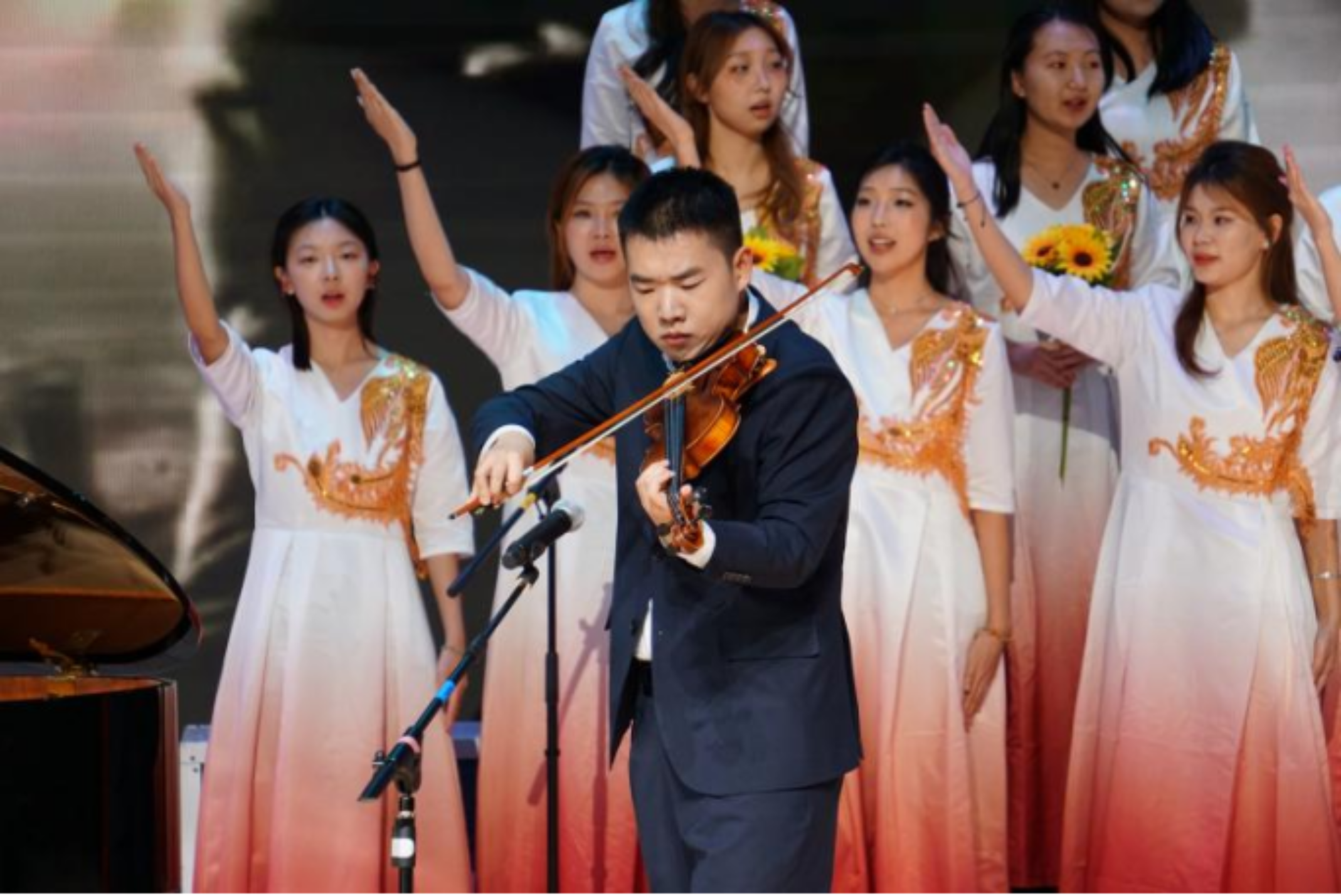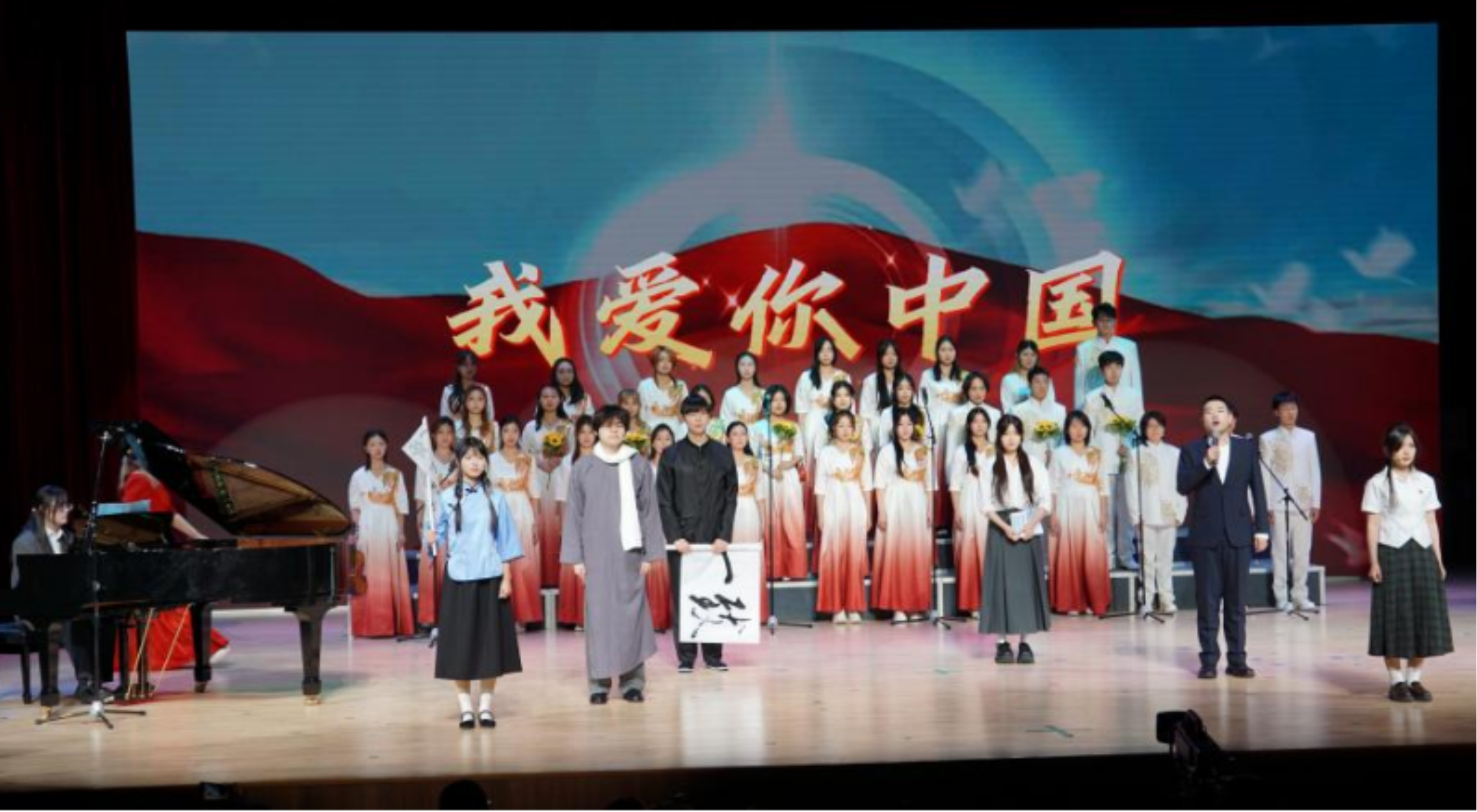 话音落处,钢琴伴奏缓缓响起,合唱队员随即齐声开唱,歌声悠扬而起。第二排的表演者们缓缓扬起手中的向日葵,紧接着,第三排的国旗也随之轻轻挥舞。随后,当“我爱你中国”的歌词缓缓唱出,小提琴旋律适时加入,与钢琴伴奏交织相融,歌声更添深情与力量。第一排的同学同步扬起手臂,舒展指尖,将灵动优美的歌唱手势,与歌声、乐声交织相融,满含赤诚。
