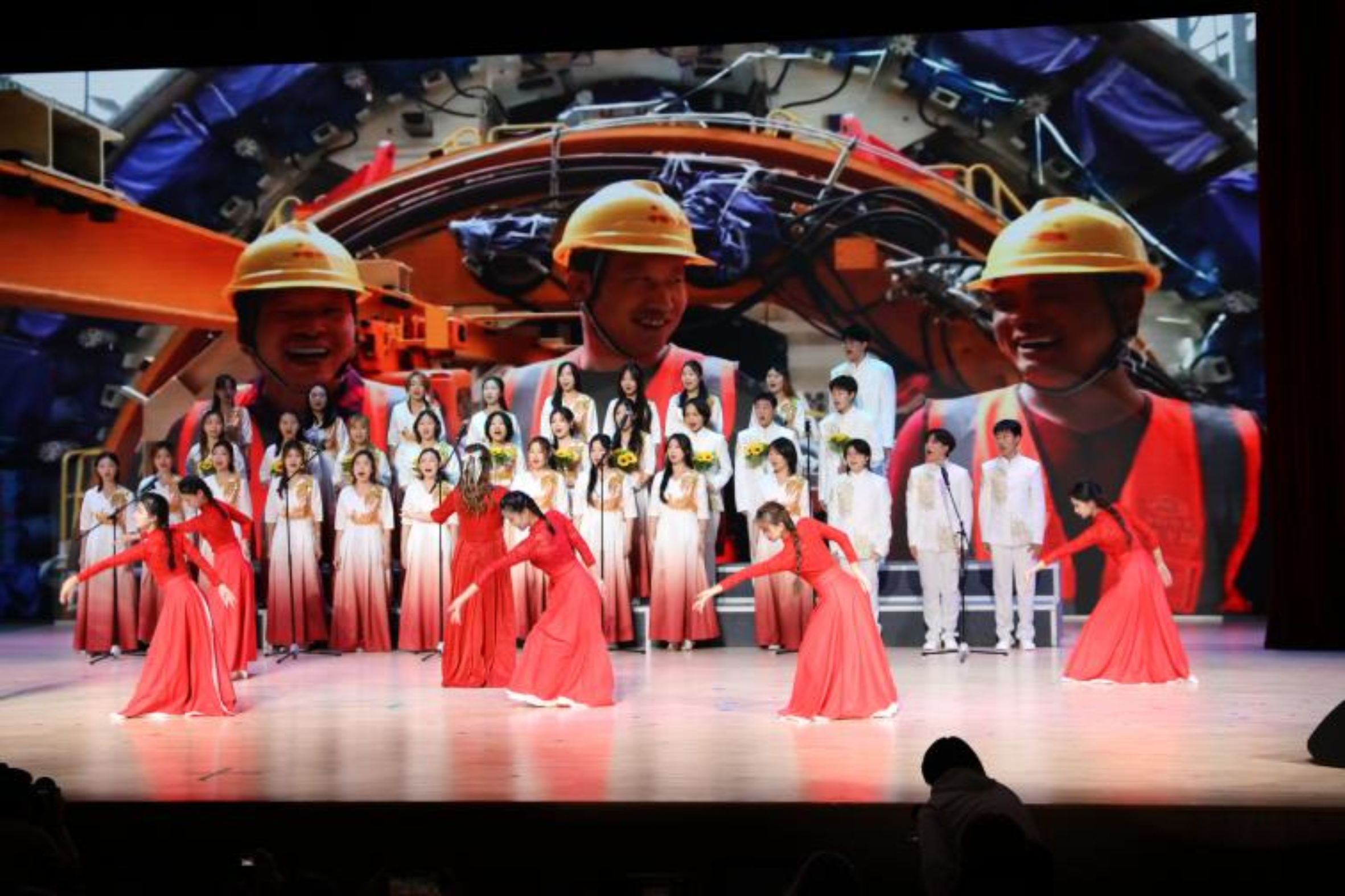 表演渐近尾声,情景剧演员与舞者一同登台,并肩而立,齐做庄重有力的收尾手势。一曲终了,全员整齐致意,圆满谢幕。