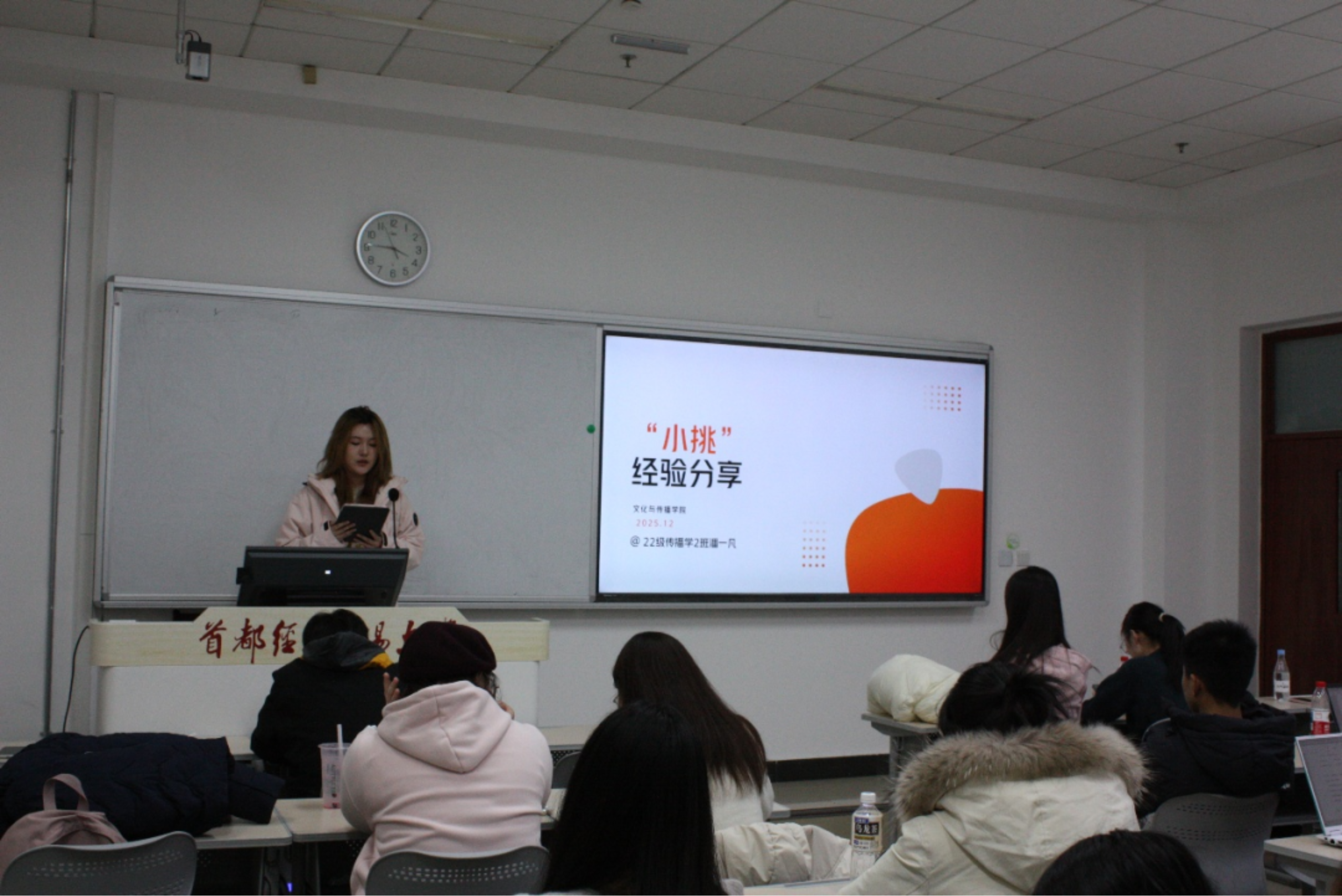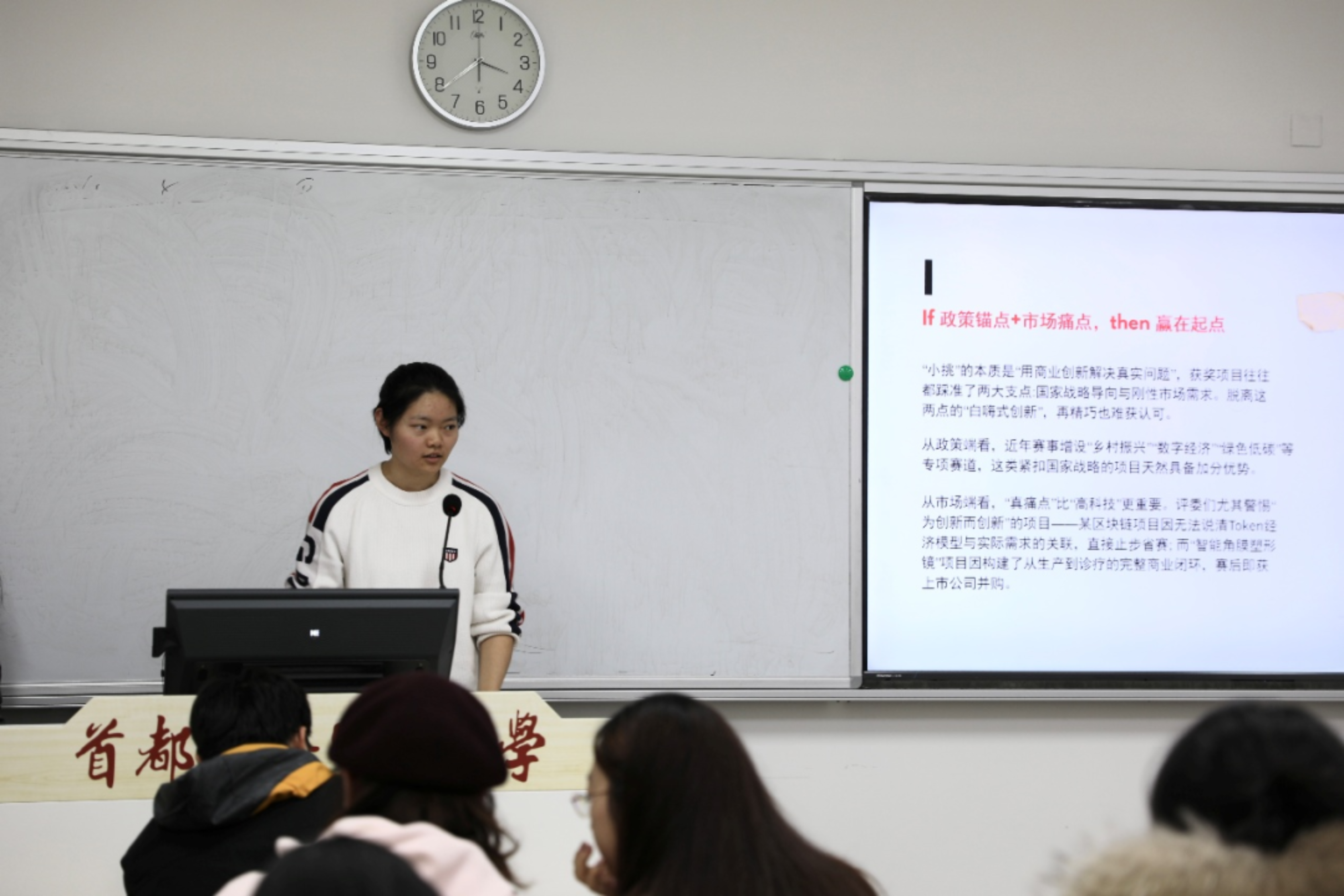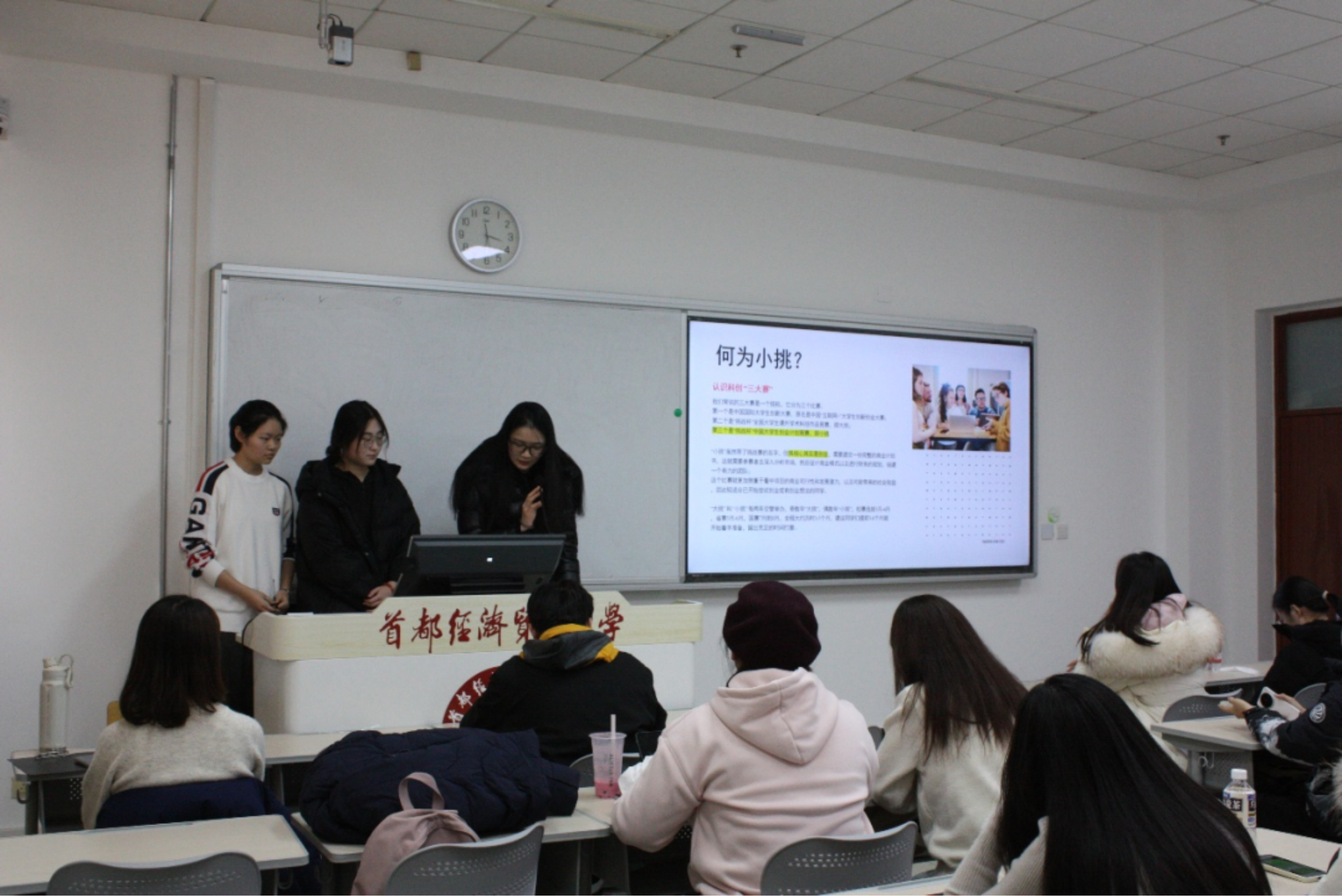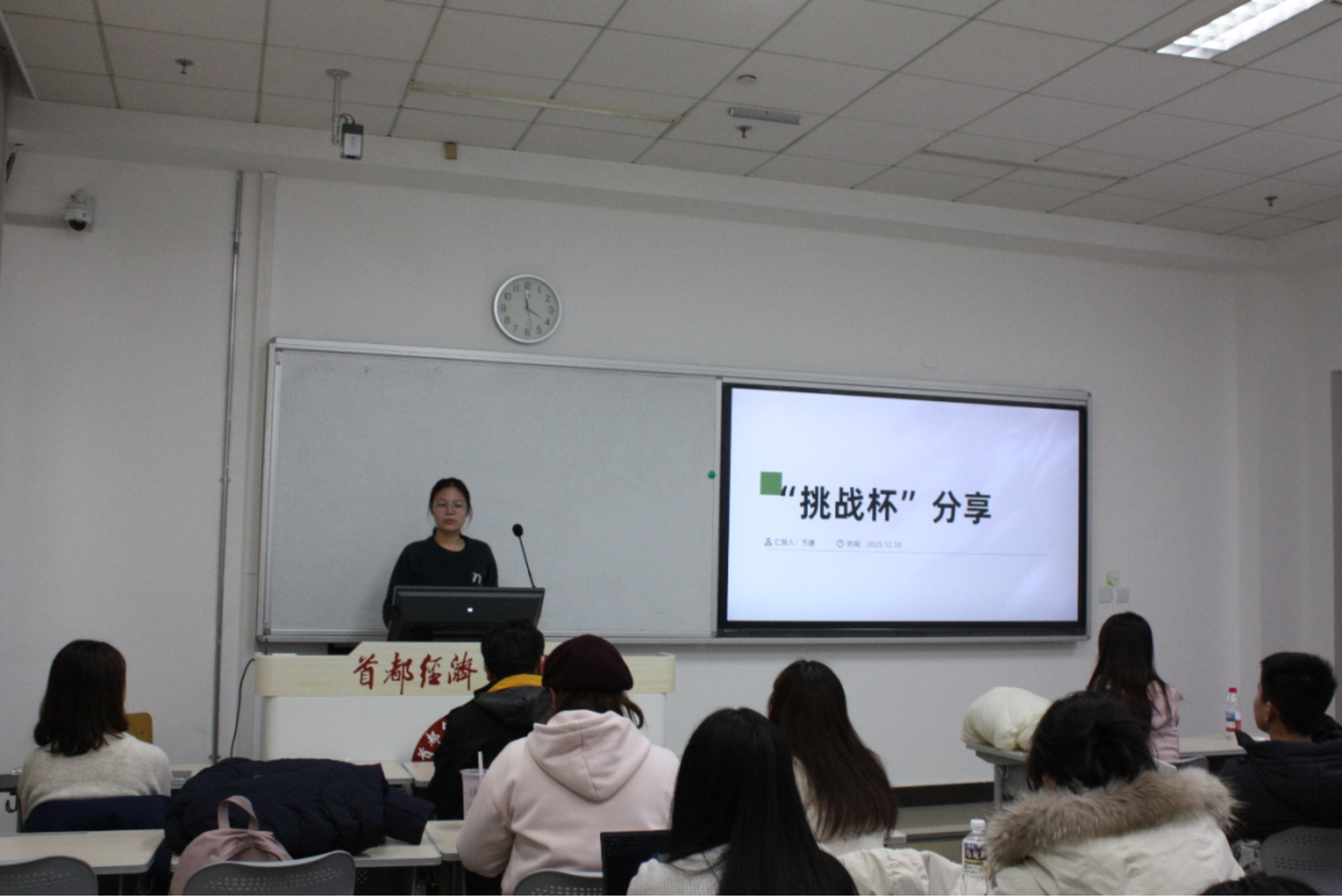 在经验分享环节,多位往届优秀学姐依次登台,倾囊相授备赛心得。吕知霏、任思涵、张颖茜聚焦备赛实操,结合自身经历,生动讲述了项目筹备过程中曾走过的弯路与需要规避的雷点,为在场同学提供了极具参考性的避坑指南。