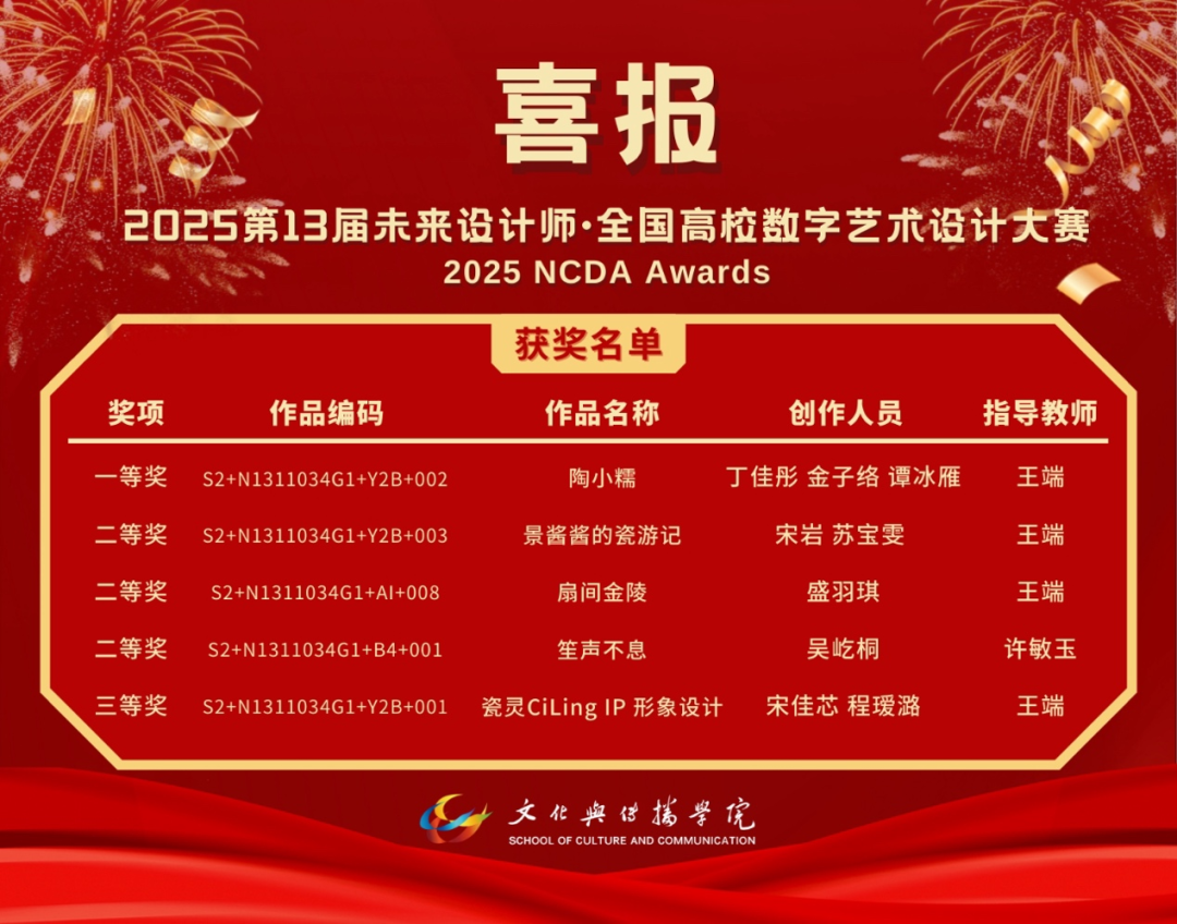 近期,未来设计师大赛·全国高校数字艺术设计大赛(NCDA)评选结果正式揭晓。作为首次组织参赛的队伍,广告学专业学生在许敏玉、王端等老师指导下,一举斩获北京赛区一等奖1项、二等奖3项、三等奖1项的佳绩,实现我校在该项重要赛事上的“开门红”。许敏玉与王端两位老师荣获“北京赛区优秀指导教师”称号。