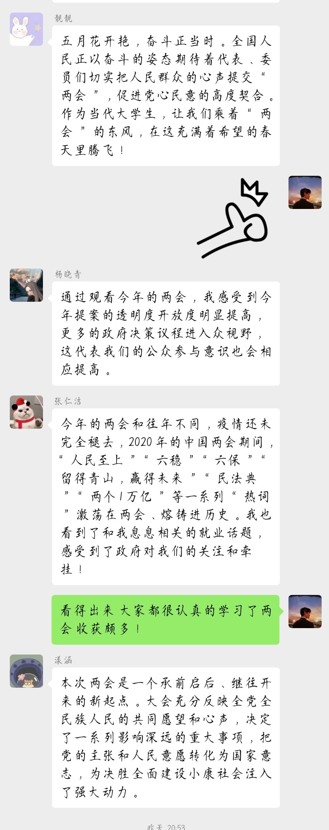不凡之年,信心之会。从“延迟”到“重启”,在疫情防控常态化阶段召开“两会”,不仅是国家给全社会注入的一剂战“疫”必胜的“强心剂”,还是向全世界传递了患难与共的中国担当、唱响了坚持开放合作的中国旋律,为全球团结抗“疫”提振信心。希望新澳门六合彩高手论坛 团员青年以此次学习为契机,将学习贯彻习近平新时代中国特色社会主义思想引入新阶段、推向新高潮,了解社会发展趋势,关注“两会”热点信息,明确学习目标,增强学习动力,努力成为新时代中国特色社会主义思想的建设者和接班人。