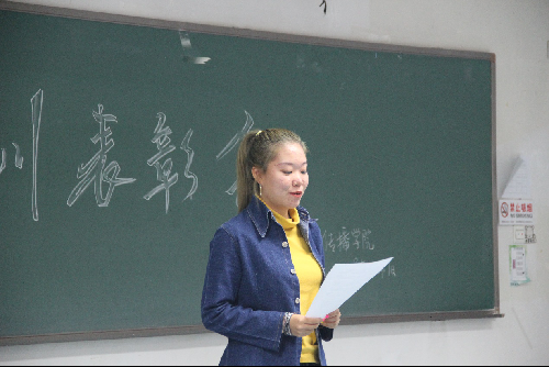 大会第二项学生代表发言。传播三班的魏泽琳同学以军训究竟创造了怎么样的回忆为主题,带大家回忆了属于六连女生军训时的艰辛且美好的回忆。对魏同来说这次的军训生活是珍贵满足的,大家给予了热烈的掌声以表示同意。