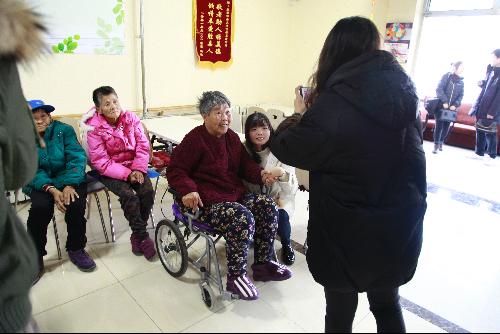 就在大厅里其乐融融时,房间里的老人也并不孤单。一部分志愿者团的学生挨家挨户串门,给在屋里的老人带去欢乐与温暖。老人们非常热情,还拿出自己的饼干水果招待学生们。
