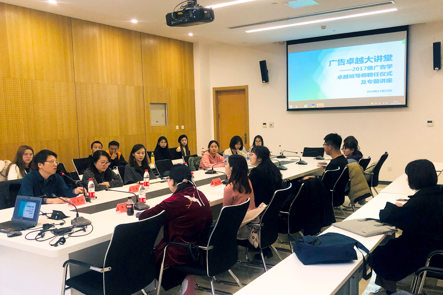 11月23日下午,2017级广告学卓越班导师聘任仪式及广告卓越讲堂在博远楼2号会议室举行。来自蓝色光标、UI中国的两位行业导师、新澳门六合彩高手论坛 副院长陆彦明、院长助理许敏玉、专业导师王端、王子琪老师以及17级广告学卓越班的全体同学参加了此次活动。