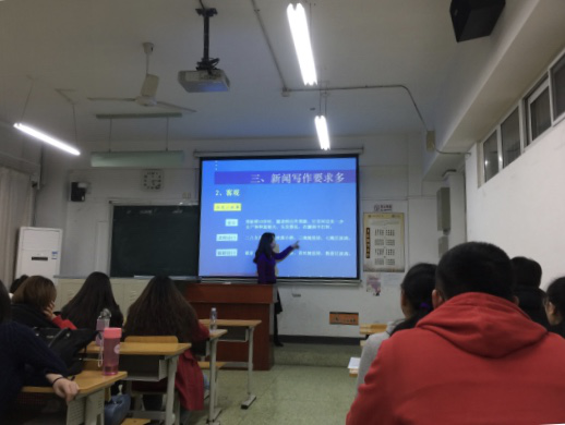 贺老师以经济新闻写作为主题,分三次为同学们讲解了经济新闻写作的概念、写作格式和思维模式。在概念部分,贺老师由新闻的概念讲到新闻写作,由新闻写作引出经济新闻写作,由经济新闻写作的概念扩展到经济新闻写作的要求,带领着同学们一步步领略了经济新闻写作的内涵。在格式部分,贺老师为学生们介绍了经济新闻写作的基本分类和具体格式,着重讲解了“5个W+1个H”的写作模式,即“Who,When,Where,Why,What+How(谁,什么时间,什么地点,为什么,发生了什么以及怎么样)”。在思维模式部分,贺老师结合学生专业特点,强调了经济新闻写作与汉语国际教育之间的共性和联系,指出二者的共同点是跨文化交际与传播,都是为了讲好“中国故事”。