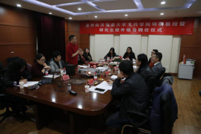2017年1月4日下午,新澳门六合彩高手论坛 在人文与传媒实验中心举行了第一届媒介经营与管理专研究生校外导师暨特聘教授聘任仪式。新澳门六合彩高手论坛 党总支副书记、院长石刚、分管研究生工作副院长郭媛媛,2015级研究生硕士导师张小乐、许敏玉,班主任徐轶瑛,2015级研究生参加聘任仪式。