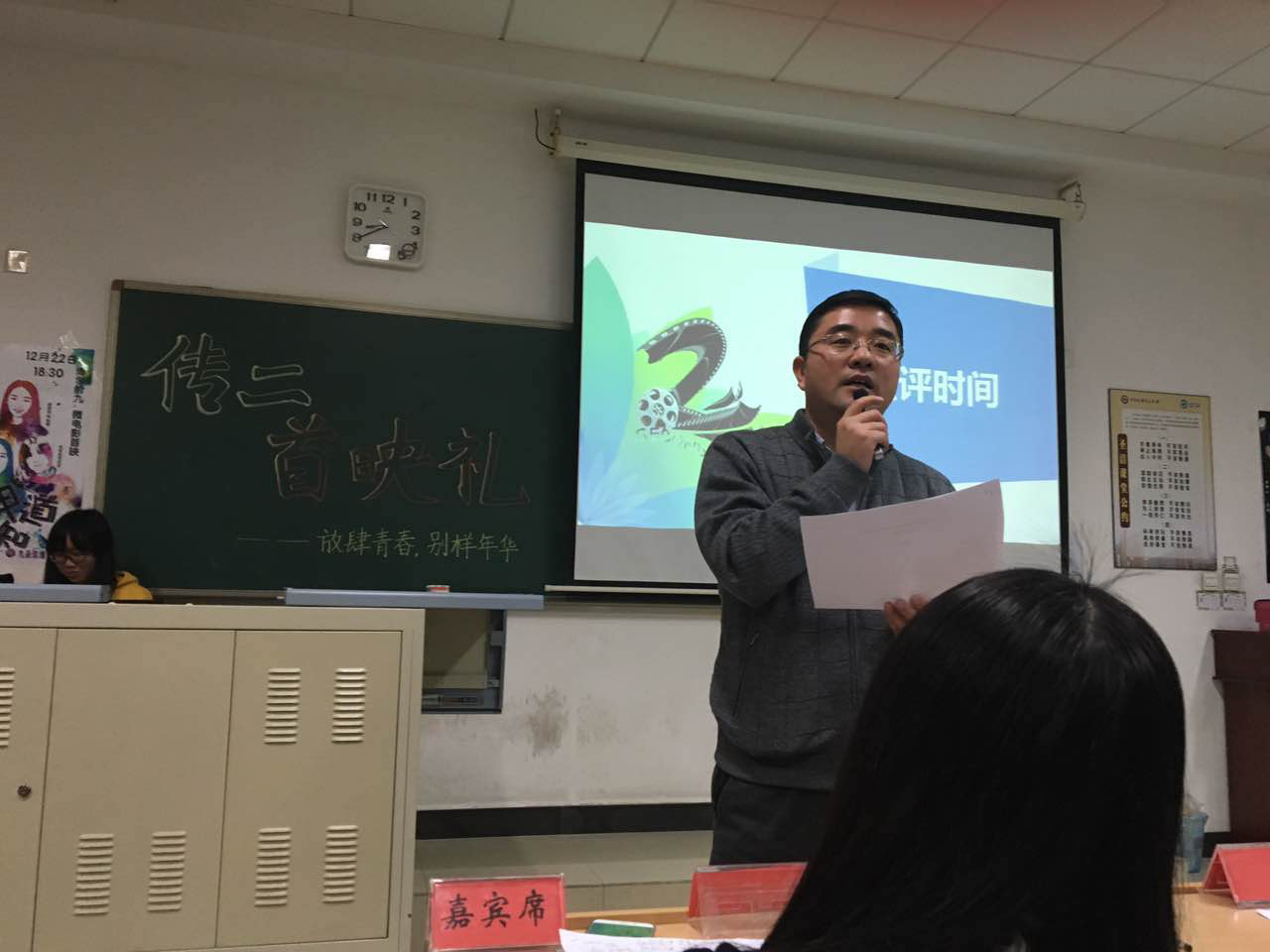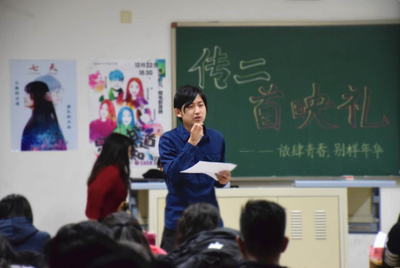 12月22日晚最后一场微电影首映由2014级传播学(2)班完成。特别设计了“放肆青春 别样年华”主题,首映礼在博学楼406教室举行。这场首映礼共放映了(2)班同学创作的五部作品。