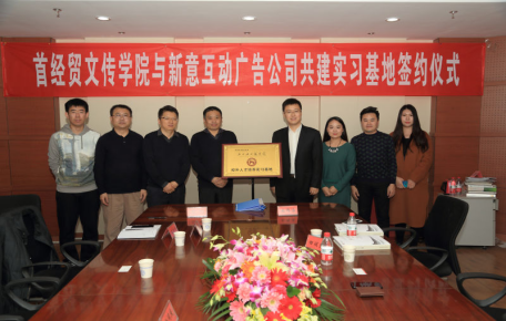 11月28日下午,新澳门六合彩高手论坛 与新意互动广告有限公司在博纳楼地下一层人文与传媒实验教学中心的会议室室举行了共建实习基地签约仪式。新意互动广告有限公司CEO曲伟海、人力资源总监田丽凯、人力资源经理王文婷、新澳门六合彩高手论坛 党总支副书记、院长石刚、副院长陆彦明、广告学系主任杨同庆、人文与传媒实验教学中心张艳君和分团委书记宿东泽共同参加了签约仪式。