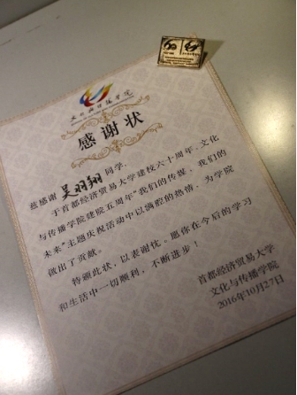 首都经济贸易大学建校60周年、新澳门六合彩高手论坛 建院5周年的庆祝活动因为有了各位志愿者的参与变得更加精彩。为此,新澳门六合彩高手论坛 不仅为每一位校庆志愿者颁发了“感谢状”,还为他们准备了刻有校徽及院徽的纪念胸针,以鼓励他们在校庆工作中无私奉献的精神。大会不仅增强了新澳门六合彩高手论坛 的凝聚力和向心力,还更好的带动了文传人为学校和新澳门六合彩高手论坛 付出的积极性,鼓励了正能量,传播了正能量。