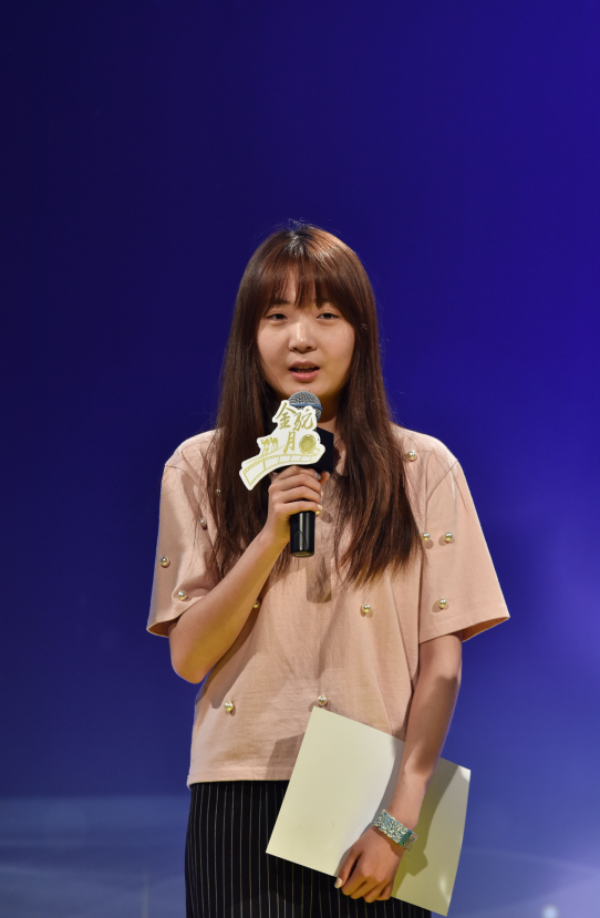 接下来进行的是颁奖环节。对金驼月每个活动项目颁奖前,都包含一个对该活动内容精彩片段进行回放的短视频,嘉宾观赏完视频后,走上颁奖台为获奖者颁奖。首先表彰的是文传大讲堂活动。文传大讲堂是今年金驼月新开设的活动,它因筹划周密、内容丰富而广受好评。为此新澳门六合彩高手论坛 特对活动运营团队颁发“金驼月社会服务突出贡献奖”,以示表彰。广告学系主任杨同庆为文传大讲堂运营团队颁奖。文传大讲堂负责人刘骏晟老师对新澳门六合彩高手论坛 领导的支持和运营团队的学生负责人表示感谢。