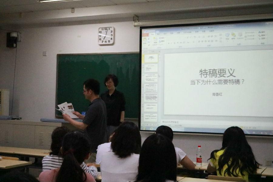 当天讲座分成两部分,前半程南香红讲授了特稿写作的要义。她以《时尚先生》杂志近期的两篇特稿《太平洋大逃杀》和《大兴安岭杀人事件》为例,告诉学生特稿不仅要精准,而且要精彩。特稿更加注重高度的文学性和创作性,它比新闻的生命力要长。她认为特稿的选题标准应该具备公共性、内涵的延展性、故事的戏剧性三个方面。记者要深入挖掘特稿的内涵,就像《大兴安岭杀人事件》,记者的眼光不仅仅关注了一个杀人事件,更反映出了事件发生区域的社会环境和文化背景。