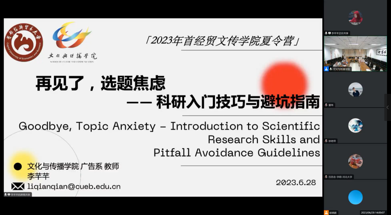 下午学硕组进行专业能力考核,首先何磊教授以《生活是最好的导师——如何快乐地从事学术研究》为主题,李芊芊博士以《再见了,选题焦虑——科研入门技巧与避坑指南》为主题分别进行学术讲座。接下来营员们结合主题讲座,通过英文资料的阅读概括、学术选题报告撰写等形式展示自己的专业能力。