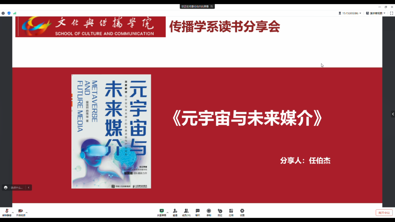 2023年7月4日上午9点,在新澳门六合彩高手论坛 传播学系主任贺心颖的主持下,传播学系第七期读书分享会在线上举行。传播学系教师任伯杰对《元宇宙与未来媒介》一书进行分享,传播学系全体教师参加了会议。