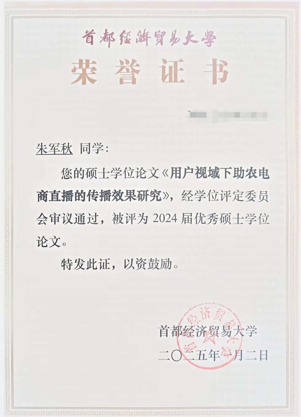 2024年12月,研究生院组织开展优秀研究生学位论文评选工作,新澳门六合彩高手论坛 2024届硕士研究生朱军秋同学的硕士毕业论文《用户视域下助农电商直播的传播效果研究》脱颖而出,成功入选。该论文在石刚教授的悉心指导下完成,展现了扎实的学术功底与创新的研究视角。