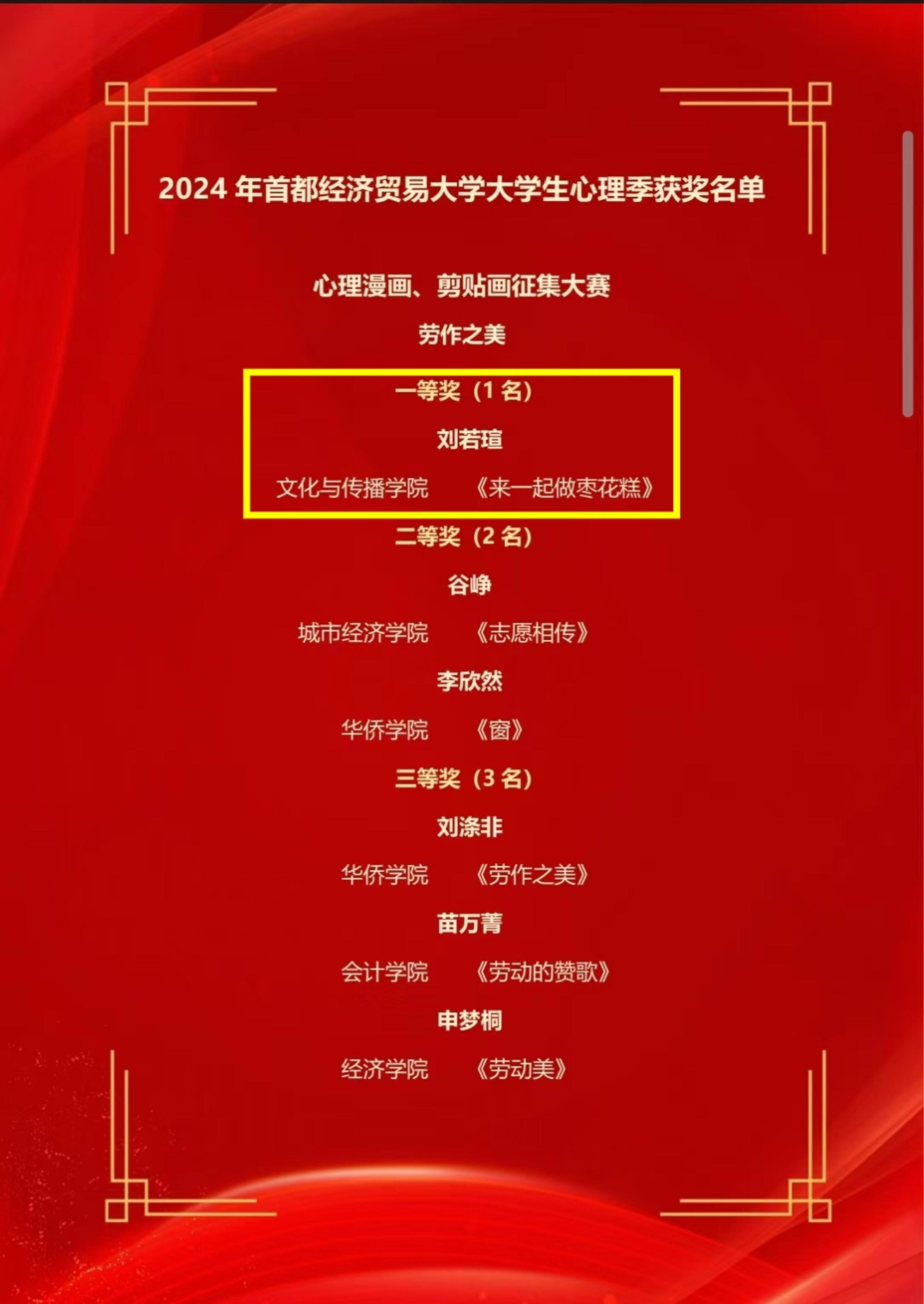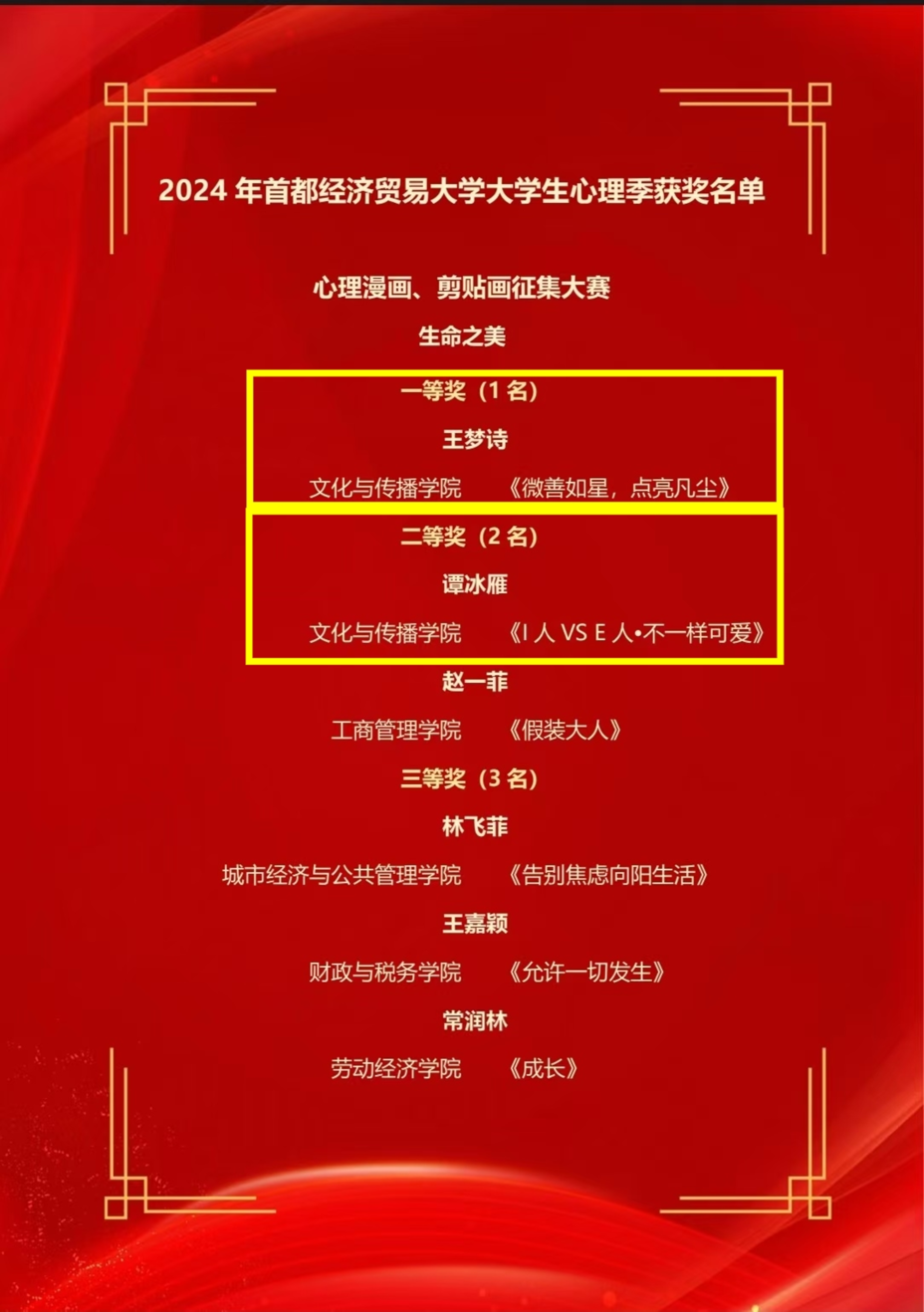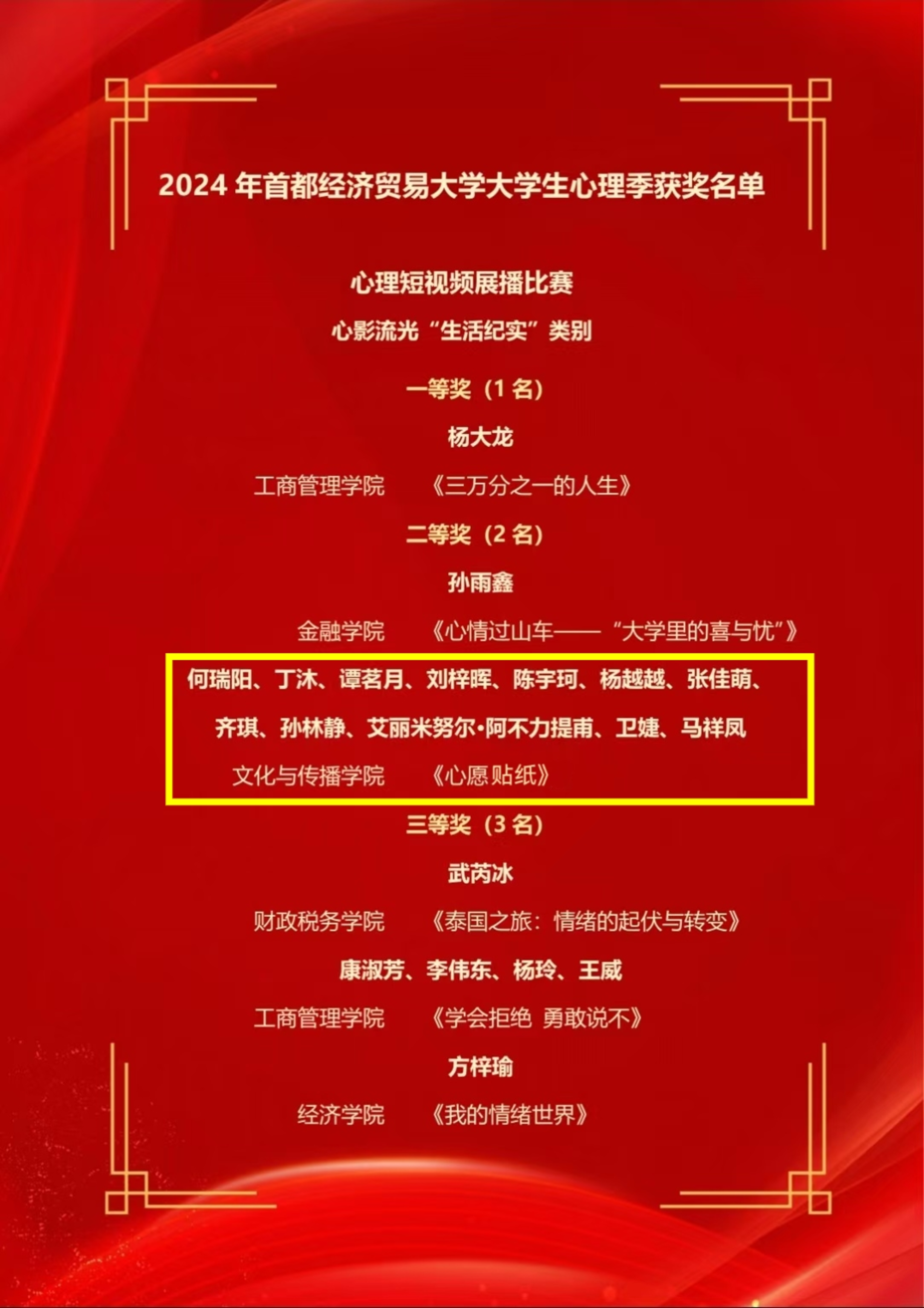 新澳门六合彩高手论坛 高度重视,积极引导学生参与各项心理健康教育活动及比赛。在这场充满创意与挑战的比赛中,文传学子凭借出色的创新思维和实践能力斩获佳绩。获奖名单如下: